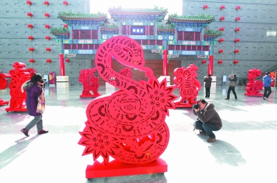 春節期間,觀眾在充滿年味的首都博物館參觀拍照。