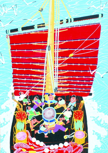 50歲的傅承峰是土生土長的日照漁民,從小就癡迷畫畫。由于年齡的原因,他現在已經不再下海,而是整日研究繪畫。“我十幾歲就下海,在海上沒有別的娛樂項目,只能畫畫,畫自己熟悉的生活。”傅承峰創作的《大蓬歌》在上世紀80年代中國首次農民畫書畫大賽中獲三等獎。這幅畫色彩對比強烈,藍藍的海,大紅的帆,海鷗繞桅桿飛翔,船上的漁民正奮力向上拉著桅桿,畫面表現了漁民奮發向上的精神。傅承峰對記者說:“沒有深厚的生活閱歷,根本畫不出農民畫。”