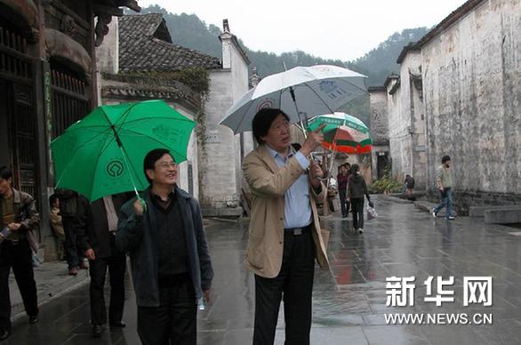 馮驥才(右)在安徽省黟縣西遞村的古民居考察(2005年11月3日攝)。新華網圖片