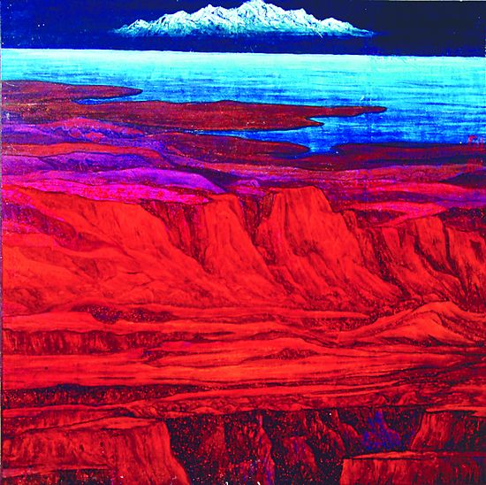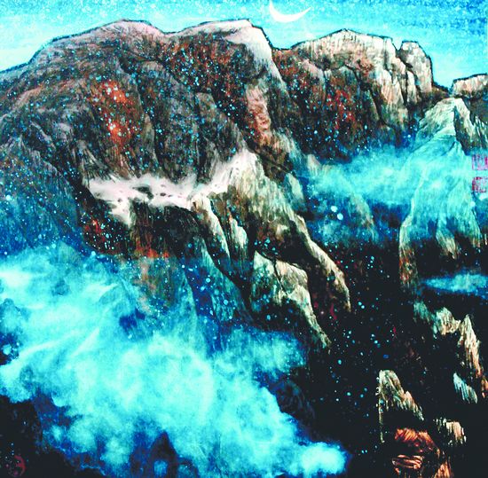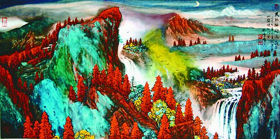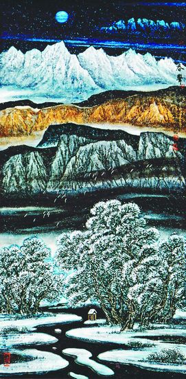 在新疆山水的色彩變現方面,目前較為成功的探索者是毛雪峰,由此,他也被人們譽為新疆重彩山水畫派的開創(chuàng)者。