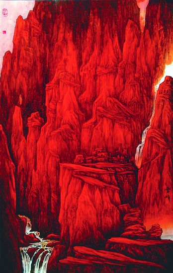 毛雪峰的重彩山水畫作,克服了上述色彩表現方面的三種缺陷。他的山水畫作,色彩的主基調,或者以深邃的藍青色為主,或者以厚重溫暖的朱磦色為主,或者以霞光燦燦的紫紅色為主,或者以赭石色為主。漫漫黃塵戈壁灘,炎炎蒸騰火焰山,青青幽寒冰雪谷,青綠漫野的天山坡,層疊奇異的雅丹地,這些顯示出新疆特殊地質奇觀的景觀,都能夠在他的筆下顯示出其色彩表現上不同于內地景觀的特定性。