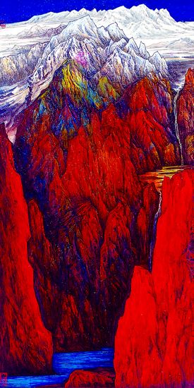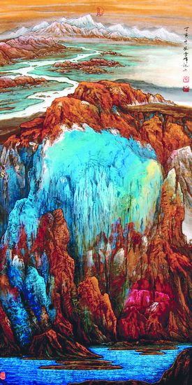 一個畫家成功的重要條件是對生活的積累和其自身所積淀的文化底蘊,但僅有積累而沒有對生活的獨特性敏感,沒有找到對這種敏感的獨特語言表現,那也不行。藝術家既要具備對自然形色的特殊性的敏感,又要具備找到解決問題方案的能力才會有所成,這實際上是審美判斷,是在文化底蘊支配下的藝術實踐。一個當代畫家要想事業(yè)有成,還必須明確自己的主攻方向,扣住課題,解決課題,有一條合乎邏輯的推進軌跡,在藝術手段的運用上要保持一貫性,絕不游離于本當解決的藝術本體之外。一旦審美指向定位了,就不屈不從于時尚的壓力,也不分心去干擾別人,盡可能地不與別人爭論那些本體之外的事情,不在本體以外用功夫,對自己的審美指向要“咬定青山不放松”。我認為毛雪峰在藝術上能形成自己風格的原因就在于此,這里我還要強調指出的是,有些人畫的山水是“畫本所有,活本所無”。相反,毛雪峰的山水畫卻是“活本所有,畫本所無”,這種含蘊辯證的一有一無便有了本質的區(qū)別。前者無生機,因循于模仿;后者有生命活力,因起于感受和發(fā)現,功在原創(chuàng)性和開拓力,這正是毛雪峰新疆重彩山水畫的核心價值所在。畫家對于自然美元素的感受經過“遷想妙得”,經過轉化、積淀、過濾,不斷的提煉升華,最終把自然的生命狀態(tài)凝聚升華為表情表意的狀態(tài),使物我之間完全通達融會,把自然生命與主體生命合成為藝術生命,這才是一種最高的境界。中國是一個有著幾千年文化積淀的文明古國,作為國粹之一的中國畫,是一個重要的文化載體,是我們得之于前人的一筆寶貴的精神財富。但是,藝術的生命在于創(chuàng)新,既要尊重傳統(tǒng)、繼承傳統(tǒng),還要能走出傳統(tǒng),開拓傳統(tǒng)。要以全新的視角把藝術置于當今時代的生活和文化情境中,借助古往今來的一切資源和手段,用獨特的、富于個性的藝術語言,在這一片廣闊的自由的天地中施展自己的才華,要站在時代前沿,發(fā)時代之先聲。上世紀80年代,我曾數次沿黃河流域上溯尋源,往復行程3萬公里。所謂大河尋源,實際上是一次精神之旅,是去探尋“以道藏藝,以藝藏道”的奧秘。我還去探險過千里冰川的長江源頭,登上喜馬拉雅山海拔6000米高處,上過喀喇昆侖、帕米爾高原、巴顏喀拉山和天山,橫跨準噶爾和塔里木兩大沙漠。如此去上下五千年,縱橫數萬里,感悟宇宙大生命,從大千世界中間求道,領會那含元報真的元氣,以使現代山水畫具有一種吞吐古今的氣度和文化底蘊,并努力以超邁的新形態(tài)與消極遁世的遺風訣別,這是我西探邊陲的重大收獲,代價很大,收獲是建構起了自己的藝術場。