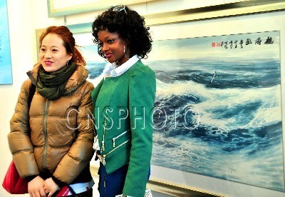 12月9日,由中國人民對外友好協(xié)會等單位主辦的“中國國際文化藝術(shù)博覽會”在北京全國農(nóng)業(yè)展覽館開幕。來自賽拉利昂的畫家愛達·楊(右)隨丈夫中國畫家楊彥參加了此次展覽,并與中國朋友在周智慧作品前合影留念。愛達·楊出生在賽拉利昂,受教于EMIBEXCOLLEGE大學(xué)商業(yè)管理專業(yè),出演過三部電影,兩次任女主角。(鄒憲 攝)