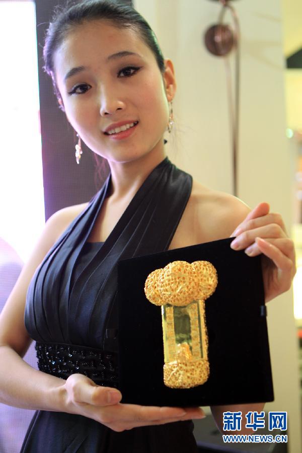 ??? 12月12日,模特展示純金納福龍龕金條。當日,2012中國國際珠寶展在北京中國國際展覽中心開幕。據介紹,本次珠寶展為期五天,來自美國、德國等17個國家和地區的1267家企業參展。(新華社發 張燕輝攝)