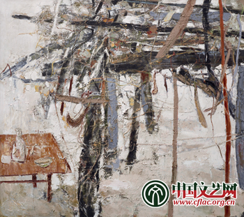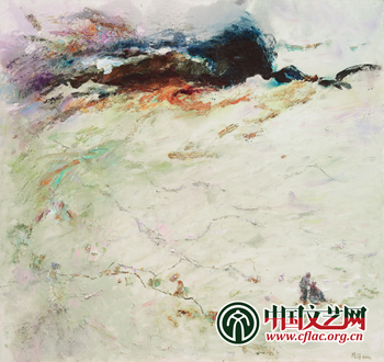 在油畫中引入水墨意象與線條之美,是中國油畫家對(duì)油畫這一外來藝術(shù)的獨(dú)特貢獻(xiàn),歐洋的《蹉跎歲月》,徐福厚的《大視野》、翁凱旋的《雪融系列》,金長(zhǎng)征的《祈》、李江峰的《化象成境——松之三》、胡大虎的《曉雪》,周建捷的《前村煙樹》、宋玉《秋天的胡楊》、張淳大寶的《松與石》等作品,都呈現(xiàn)了畫家對(duì)中國水墨畫的韻味及線條之美的理解和借鑒。他們的作品或研討線條的敏感,或著力于黑白的韻律,或試驗(yàn)皴擦的肌理,趙培智的《羈旅-馬爾楊》、黃于綱的《求全的母親和孩子》、藍(lán)威的《何處西風(fēng)》,則運(yùn)用大寫意的豪放筆觸,將書法性的用筆引入油畫語言的試驗(yàn)空間。