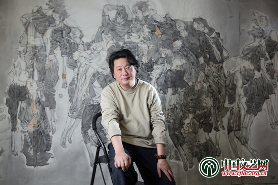 天、地、人的情景交融,人與物同在,神與物同游,是王贊作品的突出特點,也是他的情感歸宿。無論是表達歷史主題還是描繪現實人物,他的作品總有歷史感與當下性的并重,在對歷史的沉思中將視線駐落于現實,在對現實的體驗中寄注歷史的意識,所以他的作品呈現出一種古今交疊的意象。他鐘情于闊略的用筆,以勁率的線條塑造形象,同時將水墨的寫意性、抽象性與造型的寫實感結合起來,成為表現性和精神化的語言,為中國畫人物畫書寫了新的篇章。