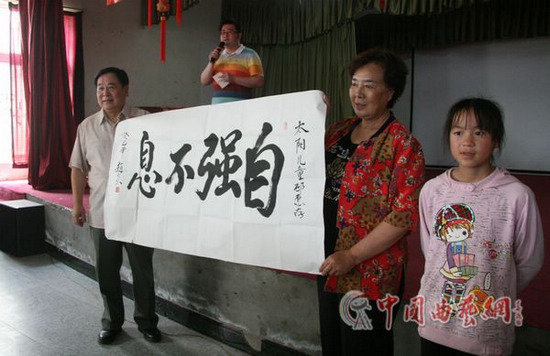 中國曲協分黨組成員、副秘書長曲華江代表中國曲藝家協會向太陽村捐贈了書籍。相聲表演藝術家趙炎把自己手書的“自強不息”書法力作送給了孩子們,鼓勵他們健康成長。