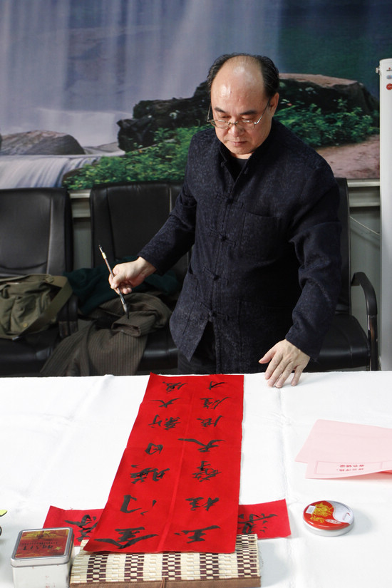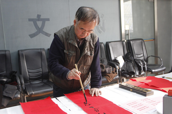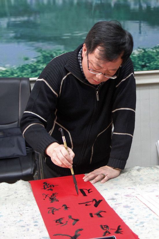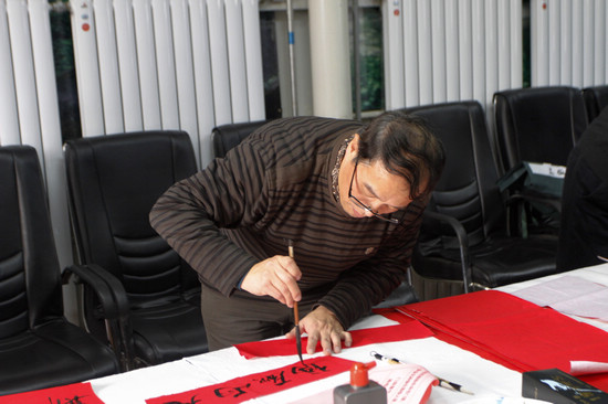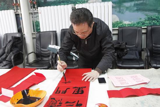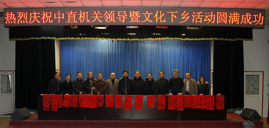 “平安即是家門福,孝友可為子弟風。”對于經歷過北京“7·21”特大暴雨、正處于經濟社會轉型期的北京房山洪寺村來說,這副春聯有著特別的意義。1月22日,由中直機關書畫協會和協會團體會員單位廣電總局書畫協會的張瑞祥、陳樹謙、孫平、趙輝、金玉杰、王書科、梁岳、邊傳久、關來順等書法家組成的送文化下鄉小分隊,在中直機關書畫協會主席武春河、中直機關工委群工部副部長舒家鑫的帶領下,到北京市房山區城關鎮開展送文化下鄉活動,贈送部分圖書,并為村民書寫春聯200余副。