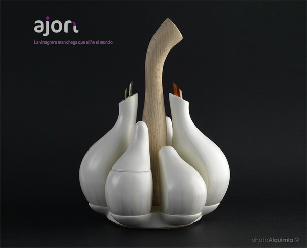 整套調味瓶的外觀設計靈感來源于大蒜這種被人們拿來調味的草本植物造型,不但每個“蒜瓣”的單體造型流暢而且使用方便,整體看上去也與餐桌和用餐環境很和諧。