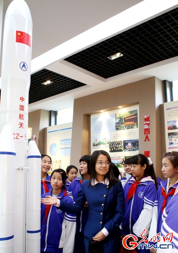 ????11月28日,北京理工大學與北京交通大學附中開展了"弘揚延安精神 分享北理美德--讓青春放光彩" 主題教育活動,北京理工大學楊賓副校長介紹說:高等教育是優秀文化傳承的重要載體和思想文化創新的重要源泉;校園文化"是一種核心價值觀的傳承",她蘊含著一所學校的育人的特色。北京理工大學作為中國共產黨1940年在延安創辦的第一所理工科大學,有著優良的革命傳統和內涵豐富的延安精神,延安精神 薪火相傳,體現在一代又一代的北京理工大學師生身上,使北理工特色的校園文化培養出了一批批推進文化傳承創新和服務經濟社會發展的優秀人才。圖為在校史館安保思想疏導師為學生們講述創辦于延安的北京理工大學的發展歷史。記者劉新武攝