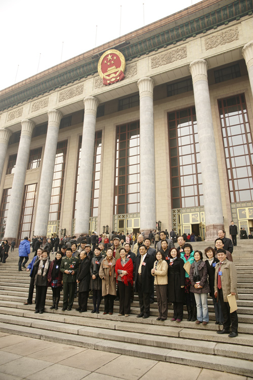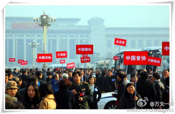 中國攝協工作人員手持“中國攝協”牌子在人民大會堂外迎候代表 萬戈 攝