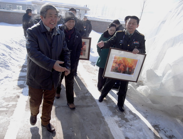 雞冠山鄉地處鐵嶺市東部偏遠山區,當天雪花飄舞,氣溫零下25度。由省文聯黨組成員、副主席伊忱帶隊,攝協主席劉志超,副主席、秘書長魯文等一行15人來到大雪覆蓋的鐵嶺縣雞冠山鄉岱海寨村,為這里村民帶來了他們每人精心準備的一幅幅裝裱精美的攝影作品及年畫等慰問品。攝影家們冒著嚴寒不顧旅途疲勞,下車就分別走進楊玉庭等五戶軍屬及低保家庭。他們一邊送慰問品一邊與老鄉合影留念并同他們親切交流。老鄉們笑逐顏開忙里忙外,就像過年一樣接待遠方來的客人。山里風很冷,但這里氣氛很溫暖。