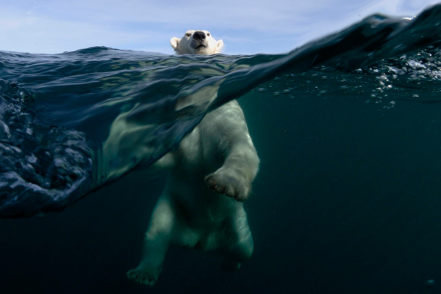 在拍攝這張照片時,攝影師距離這頭白熊僅有數英尺遠(1英尺=0.31米)。要知道,北極熊是一種會主動攻擊人類的熊,而且是游泳健將,在水中動作非常靈活,攝影師能夠在它面前全身而退是非常幸運的。