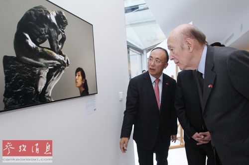 6月13日,法國前總統德斯坦(右)、新華社歐洲總分社社長王朝文參觀在法國巴黎