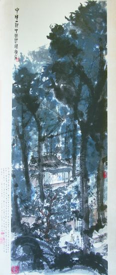 有一次,一九五三年秋,傅先生又到北京來,照舊被老舍先生請來家中作客,談話之中,突然老舍先生提到一張叫《桐蔭圖》的舊作。傅抱石先生吃了一驚,而且受了感動。原來,這是一張傅先生自己最喜愛的畫。畫的是重慶金剛坡下的舊居,是他自己住了七年的老屋。屋子建在幾株高高的梧桐樹下。傅先生用他的大潑墨和多層次的豐富筆法將整個畫面布滿了梧桐枝葉,郁郁蔥蔥,生機(jī)盎然。樹蔭之下有一間小茅屋,窗極大,看得見屋內(nèi)有三個古裝人在賞畫,他們打開一軸畫彎身觀看,好像在熱烈地討論著。有趣的是,此畫是畫他自己和朋友們,雖然是古裝。當(dāng)時,郭老曾來此觀看傅抱石作畫,見有此圖,頗為欣賞,很想收藏,傅抱石竟然沒給。別看他們是非常好的朋友。抗戰(zhàn)勝利后,傅先生將這張畫帶回南京,僅在每年春節(jié)時,拿出來懸掛幾天,然后又收起來,當(dāng)作最心愛的寶貝。