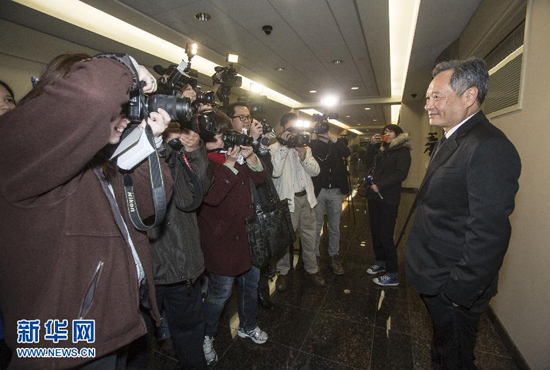 1月13日,在美國洛杉磯貝弗利山,華人導演李安(右)接受記者采訪。當晚,第70屆美國電影電視金球獎頒獎儀式在洛杉磯貝弗利山希爾頓酒店舉行。華人導演李安執導的《少年派的奇幻漂流》獲得最佳原創音樂獎。新華社發(趙漢榮攝)