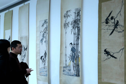 1月17日,參觀者在觀賞徐悲鴻的書畫作品。新華網(wǎng)圖片 李明放 攝
