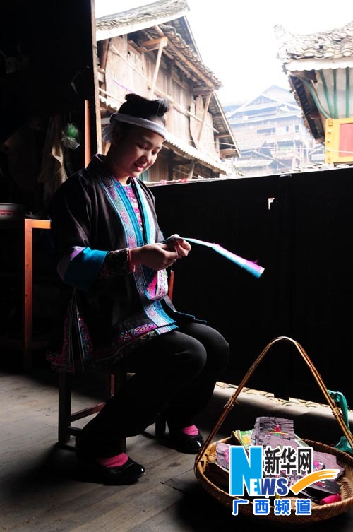 1月26日,廣西柳州三江侗族自治縣同樂鄉同樂村侗族群眾在刺繡。