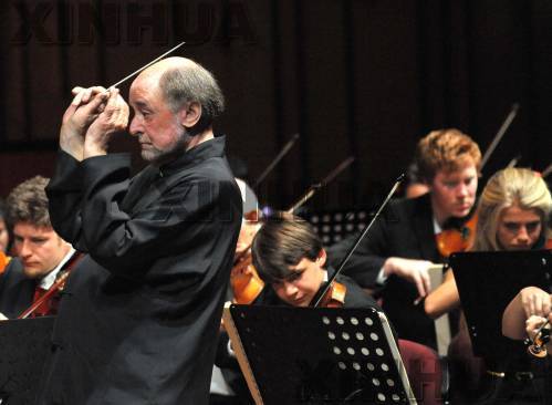 1月28日,來自英國的著名指揮家羅杰·諾林頓身著中式唐裝在南非約翰內斯堡國際莫扎特音樂節上指揮南非國家青年管弦樂隊演奏。