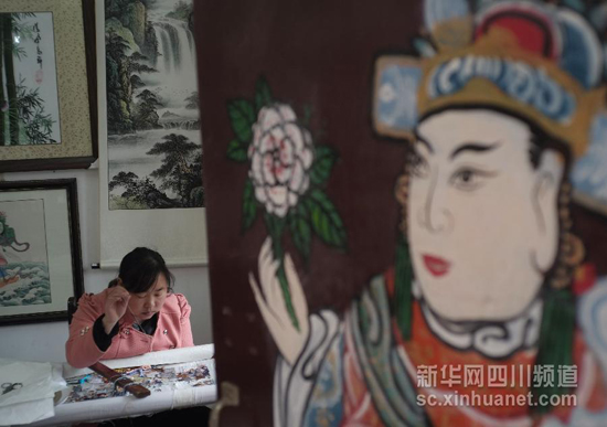 5月9日,藝人在綿竹市孝德鎮年畫村制作刺繡年畫。