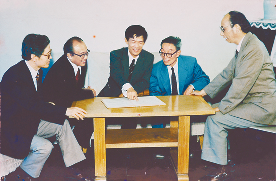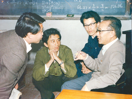 作曲系學科教師王宗鑒、張守明、薛金炎、于行、劉學嚴在進行研究(1988年)