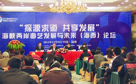 以“探源求道 共享發展”為主題的海峽兩岸曲藝發展與未來論壇,12月9日在福州舉辦,來自海峽兩岸和新加坡的曲藝家、曲藝工作者以中華“根”文化為紐帶,在全球經濟一體化背景下,探索文化多樣性和民族曲藝文化傳承發展,分析兩岸曲藝交流現狀與合作發展趨勢、閩臺曲緣文化、曲藝創作與創新、曲藝傳承、曲藝市場等問題,梳理兩岸曲藝交流活動,交流發展曲藝新理念,明確閩臺曲藝在兩岸曲藝交流中的重要地位并達成共識。研討會上,董耀鵬、姜昆、大兵以及臺北曲藝團團長郭志杰,中國臺灣相聲、評書演員葉怡鈞,新加坡相聲演員徐惠民,福建藝術學院教授趙日和,分別就《兩岸曲藝文化交流合作與發展的思考》《轉型時期中國曲藝的文化擔當》《相聲創作之我見》《臺北曲藝團經營運作之現況》《曲藝傳承的新思維》《新加坡與海峽兩岸的相聲交流》《閩臺曲緣文化》作了專題發言。中國曲協還與福建省文聯簽署了支持福建曲藝科學發展對臺先行先試的合作發展備忘錄,為兩岸曲藝合作交流可持續發展提供理論支持和制度保障。大家表示,海峽兩岸曲藝文化一脈相承、相互交融,你中有我、我中有你。兩岸曲藝獨特的民族風格、濃郁的鄉土氣息、優美的抒情曲調、擅長抒發戀人思親和游子懷鄉的真摯情懷,以及雅俗共賞的審美特征,共同構筑了海峽兩岸民眾共有的“精神家園”。