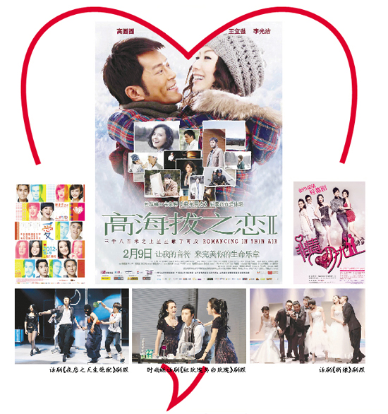 或許是2011年的“光棍節(jié)”,一部《失戀33天》的意外“殺出”令不少人始料未及。所以今年的情人節(jié)仿佛備受關(guān)注。先說說電影,今年的情人節(jié)檔共有5部愛情片公映,包括《高海拔之戀Ⅱ》《我愿意》《LOVE》《豪門生死戀》《真心話大冒險》。此外,還有原定上映的《嫁個一百分男人》《烏龍戲鳳2012》《女人如花》和《初戀時光》這4部電影“知難而退”逃離情人節(jié)檔期改期上映。即便如此,今年的情人節(jié)檔期依然“爆擠”,就目前國內(nèi)市場容量而言,一周內(nèi)最多能容納2到3部影片大賣,像這樣僅情人節(jié)一天就有三部愛情片集中上映,再加上《碟中諜4》仍有很高熱度且還未下映,前后夾擊的情況下,只為應(yīng)景的爭奪“情人節(jié)”這一天,那么多數(shù)影片成為炮灰已是必然。相比起2010年“情人節(jié)檔”的《全城熱戀》以及2011年的《將愛情進行到底》,今年情人節(jié)檔的影片給人感覺重點不突出,不僅觀眾選擇起來比較困難,對于影院來說也是一場“災(zāi)難”,排片成為他們最頭疼的事。幾部影片同時上映,在宣傳和影片質(zhì)量上基本差不多,場次有限,的確左右為難。業(yè)內(nèi)人士指出今年應(yīng)景的愛情片雖多,卻并沒有一部營銷做得人盡皆知,甚至有的影片連影院的從業(yè)人員都不知道講的什么,難以向觀眾推薦,而作為普通觀眾就更不知所以了。
