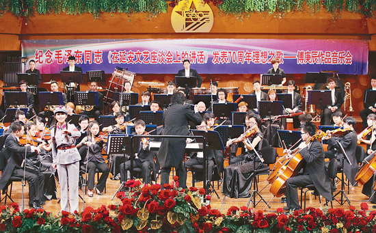 “紅星閃閃放光彩,紅星燦燦暖胸懷……”雄渾嘹亮的歌聲,響徹貴陽大劇院音樂廳。為慶祝建黨91周年和紀念毛澤東同志《在延安文藝座談會上的講話》發(fā)表70周年,喜迎黨的十八大召開,由貴州省委宣傳部、省文化廳、省文聯(lián)等單位聯(lián)合舉辦的“理想之歌——傅庚辰作品音樂會”近日在貴陽舉行了兩場演出。青年指揮家簡柏堅執(zhí)棒貴陽交響樂團,演出了中國音協(xié)名譽主席、著名作曲家傅庚辰不同歷史時期創(chuàng)作的藝術(shù)精品。音樂會后,主辦單位還舉行了座談會。大家對這臺音樂會給予了很高評價,認為這是一臺充滿革命理想主義和浪漫主義的音樂會,令人振奮,使人感佩,這些優(yōu)秀作品將滋養(yǎng)一代又一代人的心靈。