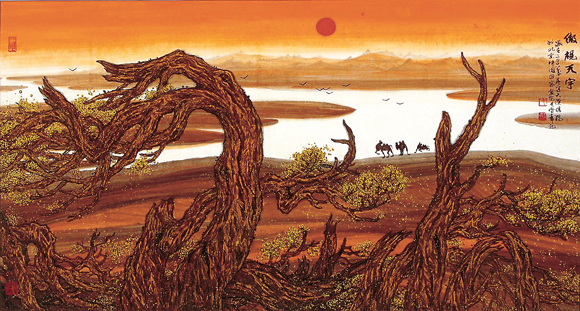 新疆占中國的六分之一,“不到新疆,不知中國之大”。但一部中國山水畫史卻沒有新疆的畫卷和記載,令人遺憾不已!由于新疆山水不同于傳統(tǒng)山水的特質,也不同于中原江南山水的特質,古人沒有畫過,現(xiàn)代人畫過的也不多。在中國山水畫的歷史演進中,在傳統(tǒng)技法和理論體系方面都沒有現(xiàn)成的范本可供借鑒,更沒有前人的路可走。作為置身新疆西域大漠的山水畫家,我們有責任和使命開創(chuàng)新疆山水畫新的表現(xiàn)形式,在新疆獨特的地域特征和豐富深厚的民族文化基礎上,吸收、借鑒古今中外一切優(yōu)秀藝術文明成果,探索發(fā)現(xiàn)并創(chuàng)造新的筆墨程式和藝術語言,“融合古今,折衷中西,繼往開來”,則是我們明智的選擇和目標。