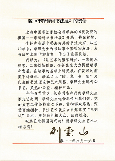 2011年8月25日,中共中央政治局委員、中央書記處書記、中宣部部長劉云山來到中國人民革命軍事博物館,參觀在這里舉行的“我愛我的祖國——李鐸詩詞書法展”。