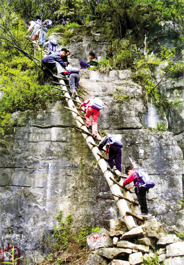 在海拔2800多米的五道天梯和90多處拐彎與絕壁相連的陡峭山路上,李桂林、陸建芬夫婦通過背、拉、扶等多種方式,接送孩子們上學和回家。 袁孝正 攝
