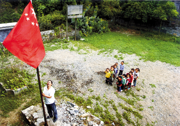 湖北恩施咸豐縣丁寨鄉天上坪教學點,劉永剛26年來堅守在教學一線,每周一他都會和學生們一起舉行升旗儀式。 王艷 攝