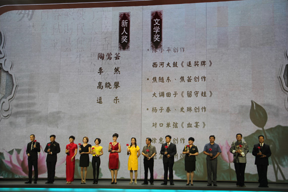 第七屆中國曲藝牡丹獎(jiǎng)新人獎(jiǎng)和文學(xué)獎(jiǎng)獲得者上臺(tái)領(lǐng)獎(jiǎng)
