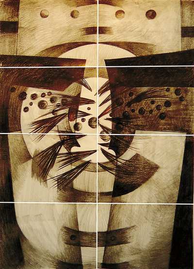 圓形,在他的畫中出現(xiàn)最多,首先象征的是太陽。太陽崇拜是許多古老民族的原始宗教,因?yàn)樘柛吒咴谏希环矫嬗盟年柟獠赣f物,但在久旱少雨時,又是炙烤大地和人們心靈的火焰,人類無可奈何。所以,他畫中的圓形圖案一般在畫的上部或中部。其實(shí),畫家最后畫成時,從既理性又混亂的幾何組合中,可以隱約欣賞到人的圖案,男人或女人的圖案,那時,他的圓形就變成了人的頭顱、心胸的象征。生活中,太陽是重要的,而人的頭腦和心靈也一樣重要,一個人失去了理性的觀照,失去了良知,那么就等于失去了生命。這樣,埃內(nèi)斯托·布哈松的太陽崇拜變成了心靈崇拜,古代的圖騰精神變成了現(xiàn)代這個物質(zhì)世界的精神追求。