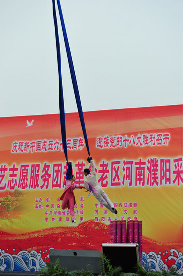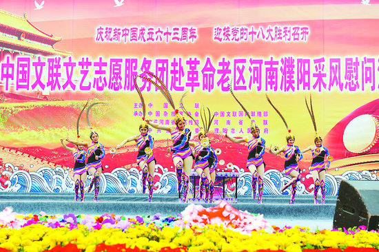 這里,為慶祝新中國成立63周年、喜迎黨的十八大勝利召開,由中國文聯主辦,中國雜協、中國文聯國內聯絡部、河南省委宣傳部、河南省文聯、濮陽市委市政府承辦的中國文聯文藝志愿服務團赴革命老區河南濮陽采風慰問演出活動正在進行。藝術家們的精彩演出和真摯祝福讓當地群眾在中秋、國慶兩節前夕感受到了喜慶與溫馨。歌聲在這里飛揚,笑聲在這里彌漫,掌聲在這里飄蕩,而“愛國、為民、崇德、尚藝”的文藝界核心價值觀也在這里彰顯和生動詮釋……
