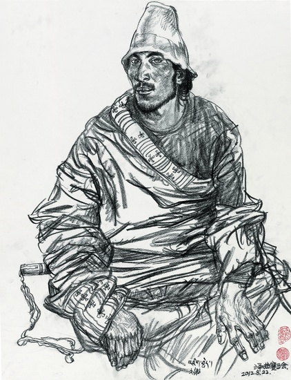 澤庫賽馬會上的牧民(炭筆、紙) 2012年8月22日