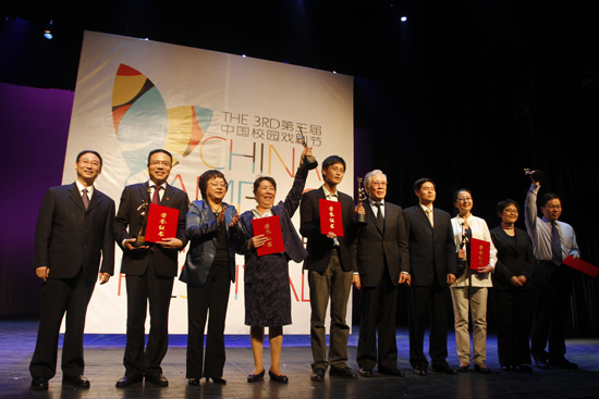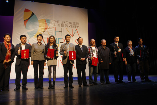 “魅力校園·青春飛揚”第三屆中國校園戲劇節頒獎典禮于10月27日晚在上海話劇中心舉行。上海交通大學的話劇《錢學森》、上海戲劇學院的話劇《國家的孩子》分別領銜普通組和專業組的“優秀劇目獎”;新疆藝術學院的話劇《水晶心靈》榮獲“特別獎”。