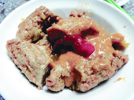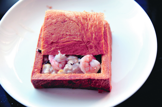 棺材板:臺南的經典小吃。做法是將吐司面包挖空,填充豬肝、鮮姜、洋蔥、柿椒、臘腸、年糕片等炒制菜品,再蓋上炸好的吐司片。由于外形酷似棺材,這道美食小吃被謔稱為“棺材板”。 摘自文化藝術出版社2012年9月出版的《臺北道地 地道北京》