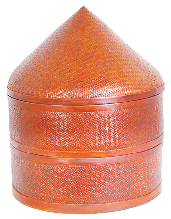 這只提籃是金再軍在嵊州收購來的。那天他在一位農戶家拍照時,無意中看到角落里放著一只提籃。此籃用很細的竹絲編織而成,精密而結實,它不同于一般的籃子,上面還有籃蓋。這只籃看起來貌不驚人,金再軍卻一眼就喜歡上了。