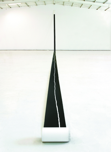 這是一個激動人心的靈感,一把圓口刻刀與一塊長長的木板,如同決斗的雙方,靜靜地等待開始的口令。一把刻刀在40米長的木板行走需要非常復雜的準備工作,從對刻刀種類的選擇,到刀的尺度與我身體的尺度相協調;木板材質則要求這種板要刀刻下去既能游刃有余,刀刻留下的痕跡還要稍微有點稚拙。40米長的一條線,用了6個小時一氣呵成??痰杜c木板接觸的瞬間如同鋒利的刀劃開皮膚,深深地,慢慢地行走,不斷深入這塊黑色平面的內部。在工作的時刻,我并不會想“人生”那么大的主題,只是去感受刻刀刻進木板里的阻頓與游刃,以及發出的咔咔聲音。刻刀在我的手里在接觸木板的一瞬間成為我精神的出口,跟隨著我的生命移動,呈現我對藝術與人生的認識。