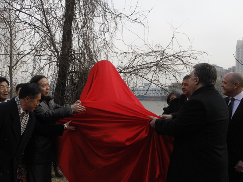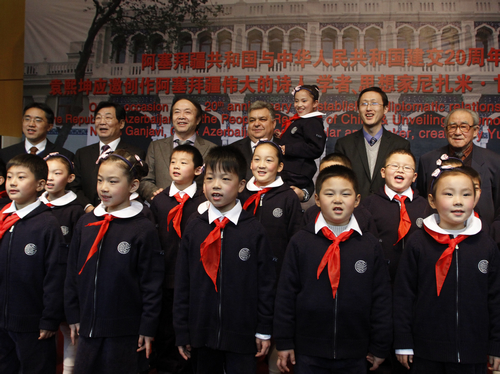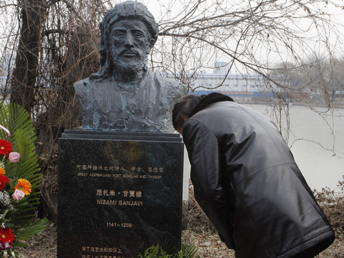 阿塞拜疆大使館古松主持儀式。演奏了阿、中兩國國歌后,拉季夫大使、袁熙坤和出席儀式的嘉賓共同為尼扎米·甘賈維雕像揭幕及獻(xiàn)花。北京芳草地國際小學(xué)麗澤分校的學(xué)生朗誦了尼扎米·甘賈維的詩歌《七美女-中國公主》。
