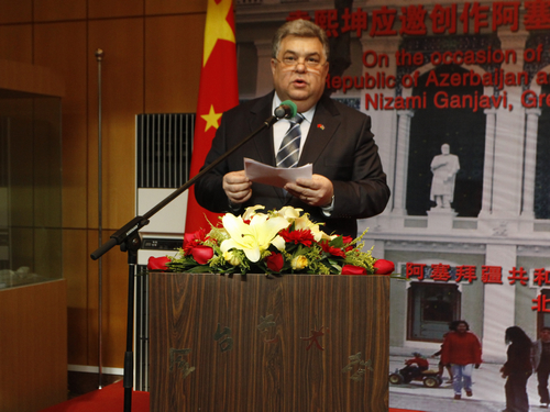 12月6日上午,為紀(jì)念阿塞拜疆共和國與中華人民共和國建交20周年,中國著名藝術(shù)家袁熙坤應(yīng)邀創(chuàng)作阿塞拜疆偉大的詩人、學(xué)者、思想家尼扎米·甘賈維雕塑揭幕式在北京金臺藝術(shù)館舉辦。中國外交部和文化部領(lǐng)導(dǎo),中國政協(xié)常委、金臺藝術(shù)館館長袁熙坤,阿塞拜疆大使拉季夫·甘基洛夫,各國駐華使節(jié)及社會各界人士共百余人出席。