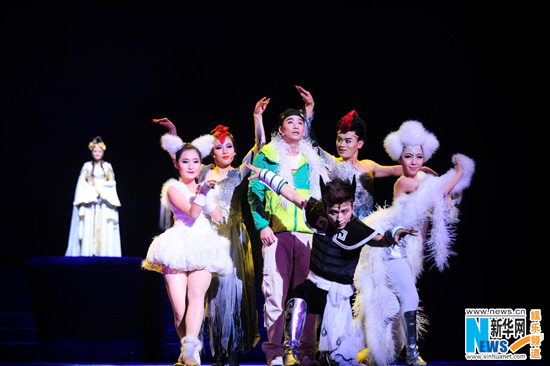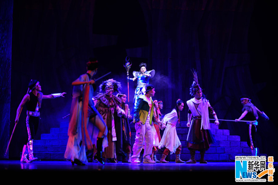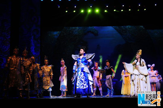 《昆侖神話》國際版吸引了國內(nèi)一線的音樂劇演員加盟,包括中文版《媽媽咪呀》Lisa的扮演者宋昕頤(飾梅朵)、音樂劇《蝶》的主演周巍(飾鄧飛)、音樂劇《蝶》中女一號的扮演者馬琦雅(飾西王母)等。新生代音樂劇演員的表現(xiàn)同樣是可圈可點(diǎn)。《昆侖神話》國際版將在北京連演五場,并赴西寧、西安、石家莊、上海等大中城市演出,正式啟動2013年全國巡演的大幕。新華網(wǎng) 李欣 攝