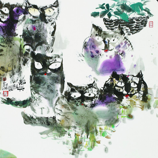 以戲曲人物畫創作揚名的馬書林,在個人展覽會上展出的作品《貓與綠蘿》展現了畫家的“另一面”