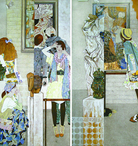 或清新、或尖銳、或張揚、或平實、或典雅、或新奇……年輕人的活力、在語言方面的探索以及獨特的藝術表現力,是這次展覽留給觀眾最為深刻的印象。比如,當前描繪時尚男女的工筆畫創作很多,同為工筆畫,《遇.見》卻把油畫的元素融入其間;《清蓮禪意》摒棄了傳統中國畫的表現手法,減掉用筆,減掉書寫性,采用了一些裝飾性的線條,體現出作者對于筆墨的把握能力;表現新疆人民古樸、純樸、質樸精神面貌的《戈壁》,筆墨到位、純熟、老練,但又不墨守程式;《破曉》將桌椅與古箏、滑板、象棋并置,裝置一般的作品傳遞出中國傳統居室古雅的氛圍;《翹楚·韻》沖破漆畫桎梏,反而發揮了西畫的特長。北京畫院藝委會副主任王志純感到這次展覽的學術性很強,所反映出來的時代氣息和時代精神是蓬勃的、創新的,“我覺得當代藝術創作最重要的一個問題是傳統藝術的時代和現實的轉換,這次展覽中的一些作品無疑完成了這種創造性的轉換”。