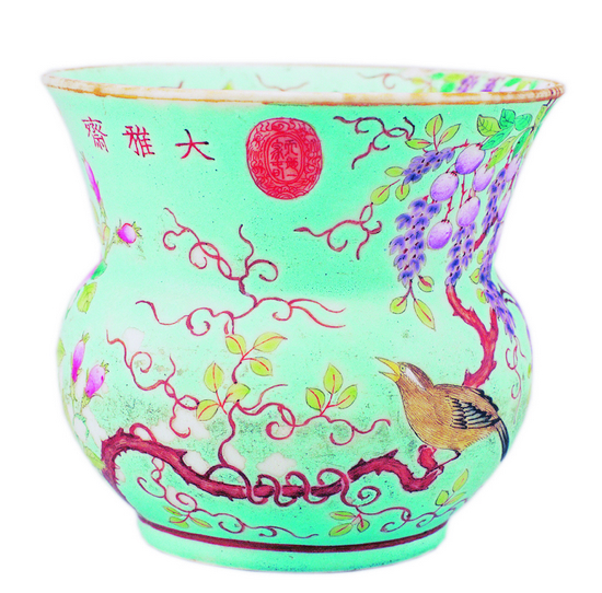 “大雅齋”款綠地粉彩藤蘿花鳥圖碗通體施淡湖綠色釉為地,上飾粉彩過枝藤蘿花和牡丹花鳥紋。過枝花卉紋是清代新創的一種裝飾技法,多用于碗、盤等圓器的裝飾。所謂“過枝”即依據花卉的自然形態,在器物里外面連接繪畫,形成一個完整的花卉圖案。而“永慶長春”款綠地粉彩藤蘿花鳥圖渣斗則精致小巧。通體施松石綠釉,釉上以粉彩繪藤蘿花鳥圖。赭色的枝干上落有一只雀鳥,配以周圍紫色的藤蘿,洋溢著歡快活躍的氣氛,繪工細膩,精致傳神,設色淡雅明麗,器型規整,釉面瑩潤,為光緒朝精美之作。外壁口沿下礬紅彩書“大雅齋”三字,旁邊鈐橢圓形紅彩印章,印章內雙龍環繞一行篆字“天地一家春”。圈足內施白釉,器底署礬紅彩楷體“永慶長春”四字雙行款。
