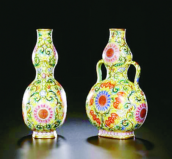 黃地洋彩福壽連綿圖綬帶葫蘆扁瓶(清)