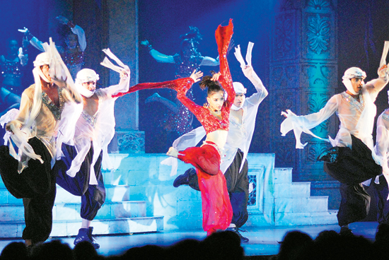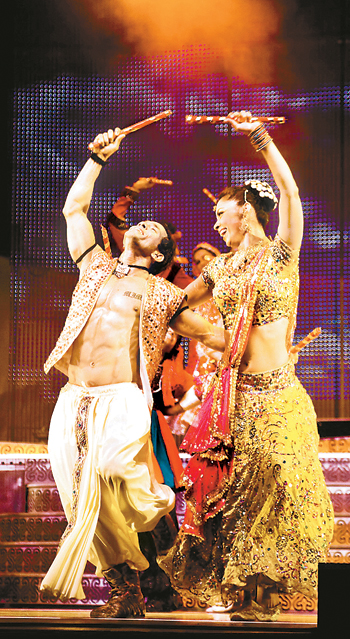 舞臺上,熊熊燃燒的火焰、肅穆的石門和暗紅色燈光中高聳的神秘濕婆神像一一展現,帶有濃厚異域風情的音樂響起,觀眾們的注意力立刻被眼前的一切緊緊抓住。古老的拉賈斯坦邦,神像俯視著蕓蕓眾生。舞者們身著長裙,歡快地飛速扭動腰胯,帶來了最純正的印度傳統舞蹈——卡塔克舞。姑娘們隨著鼓點舞起腳上的鈴鐺,清脆的鈴聲從輕柔的慢板漸漸過渡到暴風驟雨般密集。她們艷麗的裙擺和長長的頭紗旋轉打開,如同一朵朵盛放的花。敲擊長鼓的小伙子此時也跟著轉動起來,帽子上的紅纓劃出一道道美麗的弧線。迅疾的鼓點中,臺下的觀眾幾乎分辨不清節奏,卻仍用掌聲緊緊跟隨著他們的跳動……《寶萊塢明星》憑借著最純正的“印度風”,感染著現場的每一個人。