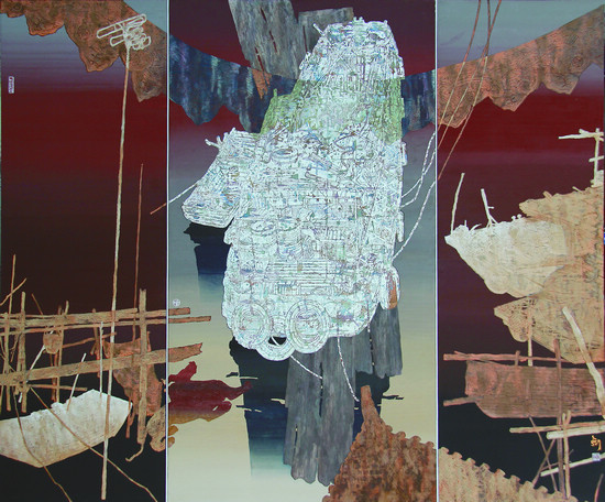 洪澤湖碧波萬頃、荷香魚躍,素有“日出斗金”之稱,修建于秦代的洪澤湖大堤,被譽為“水上長城”。畫家欒劍選取了他最為熟悉的漁家生活和文化遺存作為繪畫創作的原始素材,絕非是出于獵奇的偶然。在淮安書畫院,有個像欒劍一樣醉心于藝術追求的畫家部落。作為一名基層美術工作者,服務于民眾是他們美術創作的原始動因。出于對家鄉的熱愛和文化的自覺,同在淮安書畫院供職的陳書生、趙家葆、杜愚、張曉倩、崔競文等淮安籍畫家,紛紛拿起畫筆,用水墨和油彩抒寫著他們生命里的感動。淮安市文廣新局深諳“藝術貴在創新,一手生活、一手傳統、一手創新,畫家要從生活中汲取創作源泉(馮大中語),”為書畫院的每位書畫家提供了良好的創作條件,鼓勵他們走出去寫生、創作、研修,關注民生,謳歌家鄉的美麗與祥和。受淮安這種人文和藝術氛圍的感召,來自外省市的左希文、汪秀南、田助仁、范海龍等先后考進淮安書畫院,成為專職畫家。欒劍讀大學時學過油畫,基本功很扎實,曾經是一名優秀的美術教師,后因工作需要調到淮安市書畫院任院長。正是在這種文化理念和背景下,欒劍來到了北京,先后求學于中國人民大學林凡工作室、首都師范大學郭繼英重彩工作室、文化部重彩高研班。在跟隨中國工筆重彩大家郭繼英求學期間,欒劍的思想和畫技得到了迅速的提升,長期的生活積淀與感悟在重彩工筆山水這塊溫潤的土壤里發芽。在導師的指引下,他找到了最適合自己的表現淮安地域文化的形式和語言,淮安千年的水性,被他提升成重彩表現的繪畫符號:充滿漁家生活氣息的船屋、述說著淮安千年滄桑的河下古鎮民居,記錄著淮安文脈傳承的清江浦樓……大湖揚帆,人水共諧。在欒劍此時的眼中,山水已不再是一個名稱,而是“一個美學理念、人文概念,是靜觀自然和社會之后去組合的理想家園,這個家園是水土,是養育他的水土(謝振甌語)。”郭繼英對學生們說過:空間構成了我們的存在,存在決定著意識,意識外化為文,文如其人,作為畫家,其文終顯于畫面,比起抽象的文字,具象的畫面更能直觀地濃縮共性存在的理由,展現個性的審美訴求。羅中立正是通過《父親》這個已經成為中國農耕文明時期所有農民父親的時代性標識,完成了父親主題的創作主體個性向人文共性的華麗轉身,成為中國美術史上油畫創作的重要篇章。欒劍的水上家園系列作品,“勇于將江南淮安的城市面貌巧妙的歸結,并用綜合的藝術思考進行了提煉,將西方、日本有益的元素融入中國畫的多點構圖、散點透視中,給人以新的視覺享受(李魁正語)”。欒劍和他淮安的同仁們會繼續用中國畫的獨特語言,向我們解讀著淮安人行走在水上的千年神話,詮釋著他們對家鄉水文化割舍不斷的臍脈情結:你若安好,便是晴天。