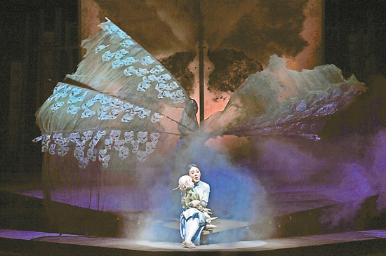導演彼得·威爾遜青年時曾在劇中飾演人偶操縱者,如今已是國際著名偶劇大師的他自然不會放過這個展現(xiàn)才華的機會,要將他對于人偶舞臺呈現(xiàn)的心得用到極致。《蝴蝶》中的偶戲源自東方傳統(tǒng)的凈琉璃文樂木偶戲,在劇中,偶的操縱者是可見的。從演出呈現(xiàn)的效果來看,操縱者更多扮演的是一個隱形的見證者,但是他與偶之間卻有著一絲說不清道不明的感情糾葛。導演之前就曾表示,劇中偶的運用往往帶有隱喻,是人物情感和思想的延伸。從全劇來看,偶的使用共有3種:一是小男孩偶,代表巧巧不滿3歲的兒子,他貫穿全劇,與巧巧、夏普里斯等人進行互動;二是巧巧偶,代表3年前的巧巧,只在巧巧的回憶中出現(xiàn),當舞臺上復原出當年巧巧與平克頓的婚禮及洞房之夜時,巧巧偶頭戴紅蓋頭與新郎舉行著儀式,而真人巧巧則默默地在一旁充當敘事者和旁觀者;三是蝴蝶偶,由兩片巨大的蝴蝶翅膀組成,在巧巧抱著兒子坐在臺口演唱有關擔憂孩子前途命運的核心唱段時,偶操縱者會在她身后將這對翅膀大幅度舞動,并配以燈光、煙霧等舞臺效果來表現(xiàn)巧巧此時心潮的涌動。